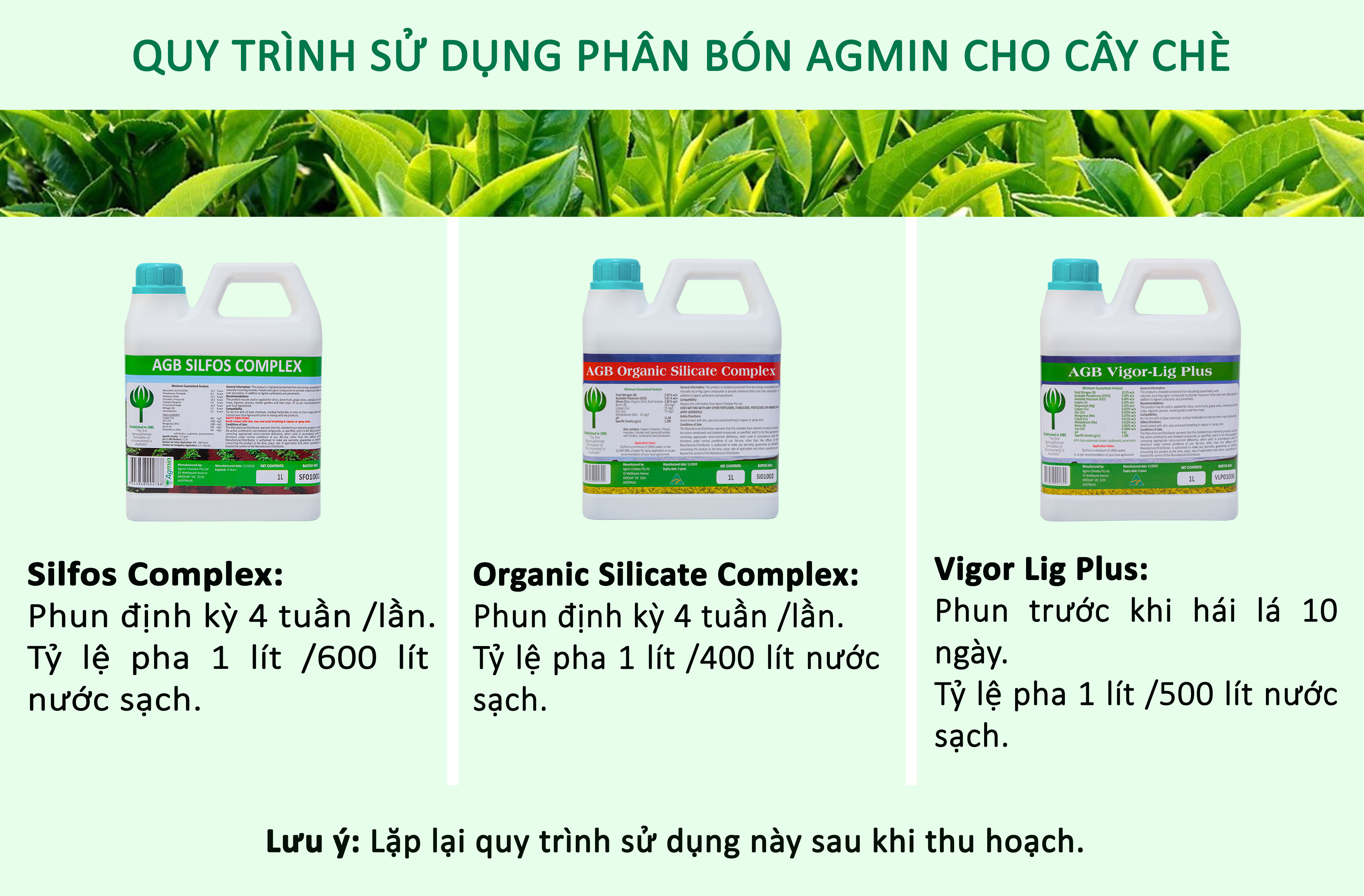 Gồm có 4 sản phẩm được phát triển bởi Agmin Chelates - nhà sản xuất vi chất dinh dưỡng hàng đầu nước Úc. Công dụng: Tăng năng suất 20-30%, Tăng thêm 1-2 vụ hái / năm, Tăng tuổi thọ của cây, Phẩm chất lá chè xanh mướt, chất lượng thơm, vị ngọt thanh không bị chát và đắng, Bảo quản được lâu hơn, Giảm thuốc bệnh, sâu.