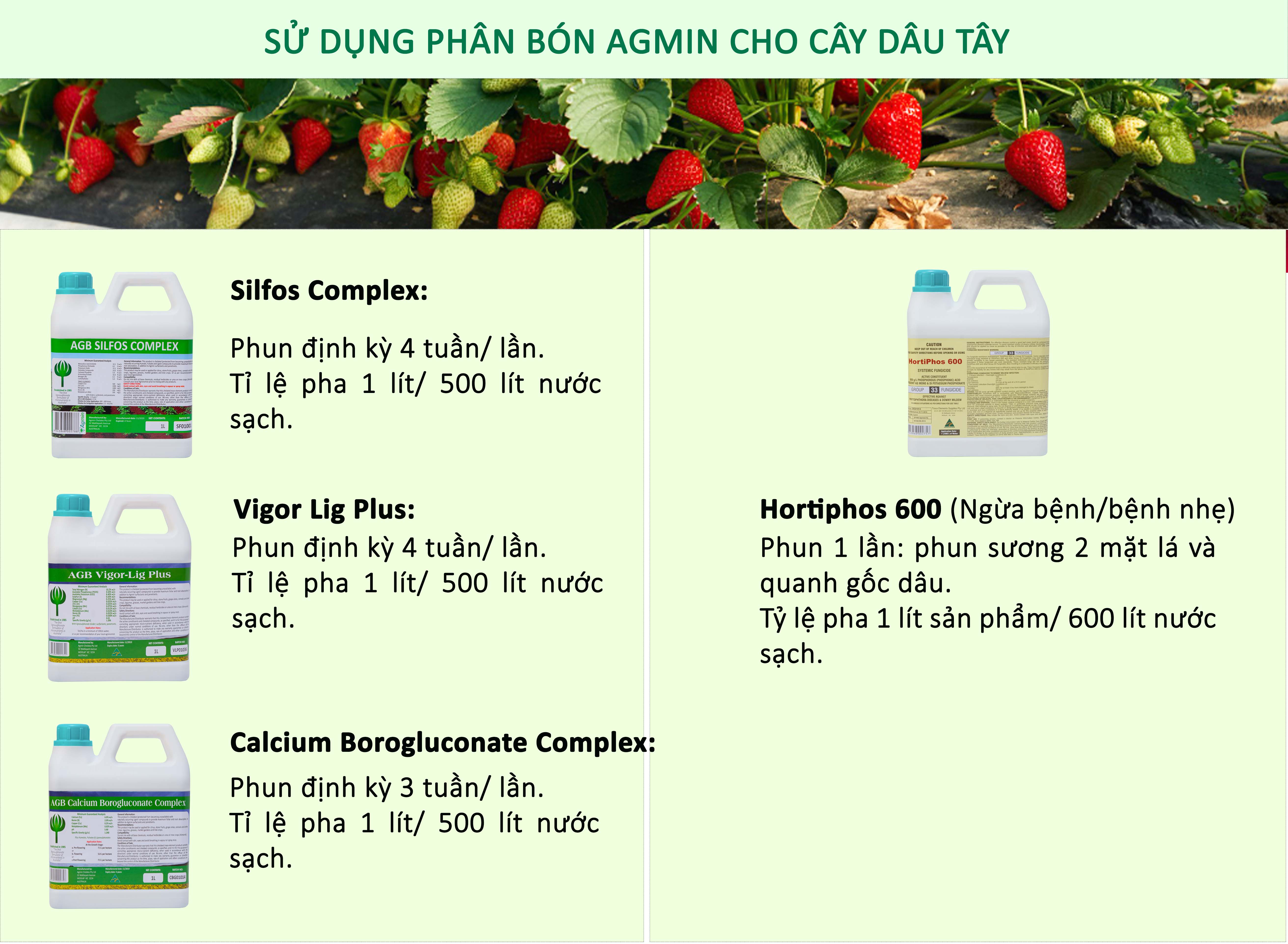 gồm có 4 sản phẩm được phát triển bởi Agmin Chelates - nhà sản xuất vi chất dinh dưỡng hàng đầu nước Úc. Công dụng: Tăng năng suất 20-30%, sai quả, Phẩm chất dâu tây: thơm, chắc, ngọt, giảm trái móp méo và giảm trái nhỏ, Bảo quản được lâu hơn, Giảm 50% chi phí phân NPK, Giảm thuốc bệnh, sâu hại.