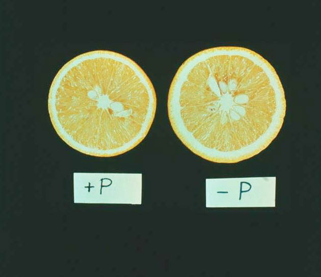 Quả khá thô, vỏ dày, ít nước và có hàm lượng axit cao (chua nhiều). Ngoài ra, thiếu hụt Phốt pho còn khiến cho lá ngả sang màu vàng đồng.