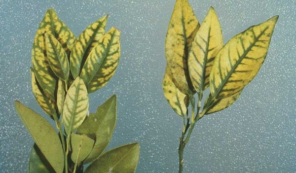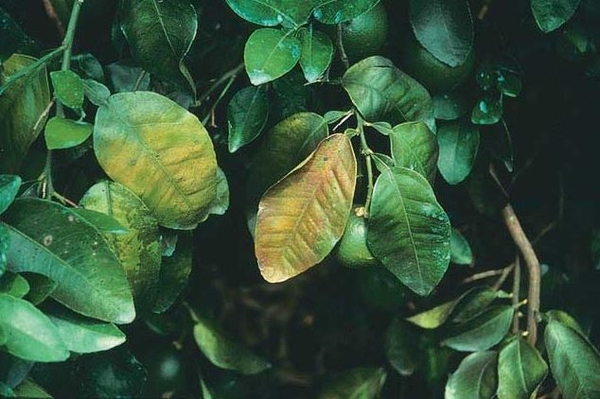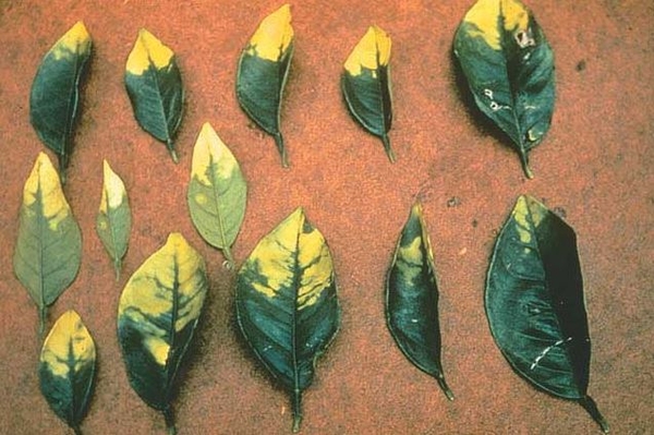 Ban đầu, trên lá xuất hiện những đốm nhỏ màu vàng và gân lá vẫn còn xanh. Bước sang giai đoạn nghiêm trọng hơn, thịt lá ngả sang màu vàng, lá sinh trưởng nhỏ với phần đầu lá nhọn hẹp. Cây cam quýt bị bệnh cháy lá cũng sẽ có các biểu hiện tương tự như vậy.
