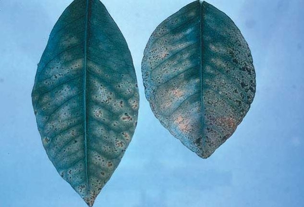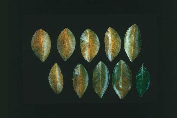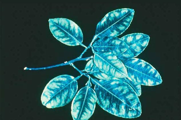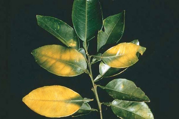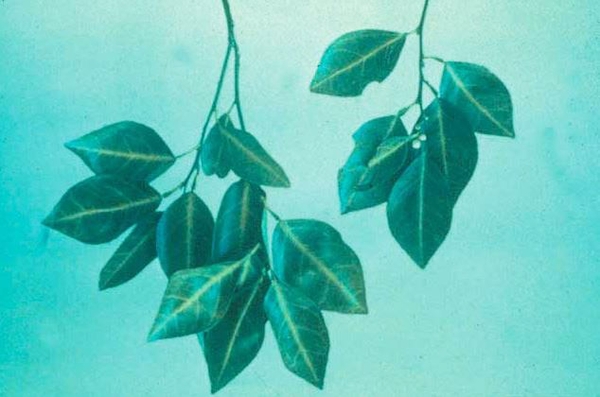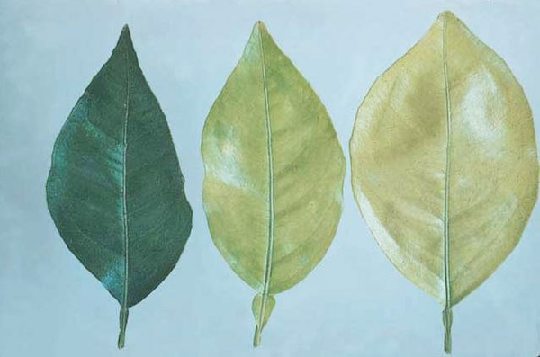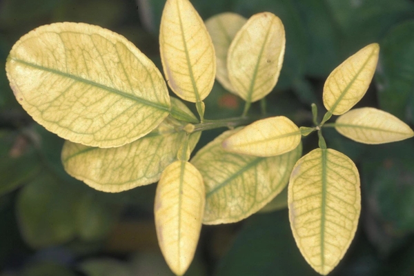 Trong trường hợp nhẹ, gân lá chuyển sang màu xanh đậm. Trong những trường hợp nghiêm trọng, thịt lá chuyển từ màu xanh sang vàng hay trắng, nguyên do là lá đã mất đi chất diệp lục. Cuối cùng, cây kiệt sức, sức sống kém, cành và tán bị chết héo.