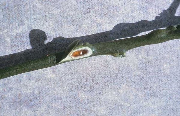 Ở các đốt cây, bắt đầu tích tụ gôm, một thời gian sau, thân cây nứt nẻ và gôm chảy ra. Thân cây thiếu đồng ốm yếu hơn bình thường, bẹt và có góc cạnh. Nhánh cây chết từ phần ngọn vào, chất lượng quả bị ảnh hưởng nghiêm trọng.