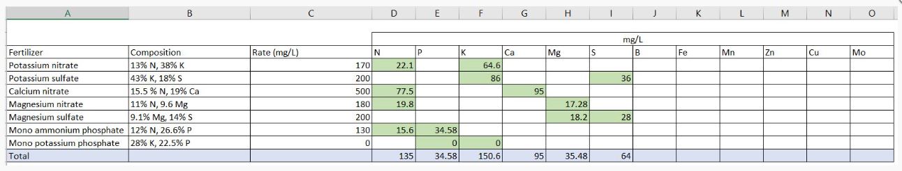 Bởi vì đối với một số chất dinh dưỡng, chúng ta phải sử dụng nhiều loại phân bón khác nhau, do đó, nên lập 1 bảng Excel (như bảng mẫu dưới đây) bao gồm các loại phân bón sẽ được sử dụng và tỉ lệ chất dinh dưỡng mà mỗi loại phân bón đóng góp.
