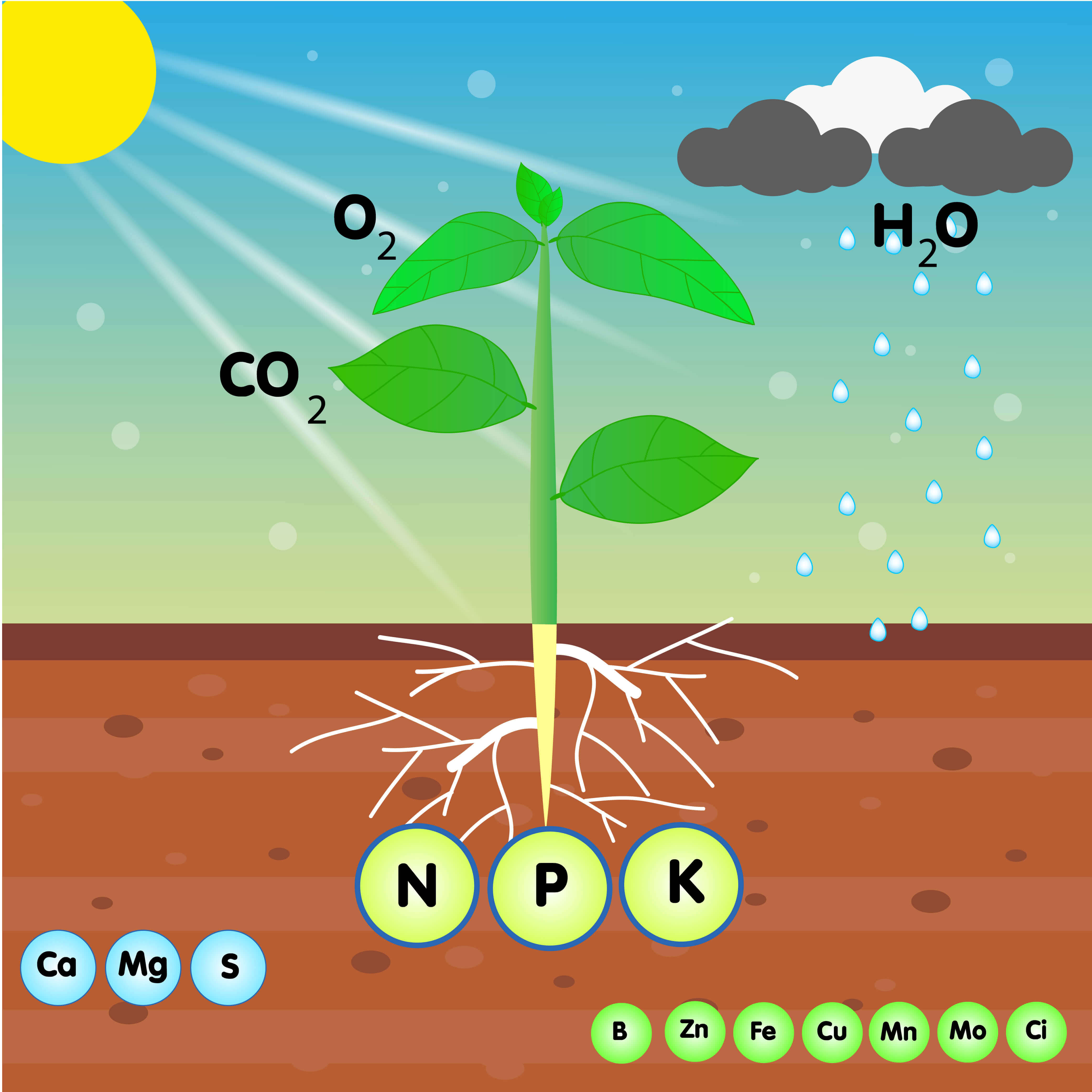 Theo nghiên cứu khoa học, có 18 nguyên tố là những chất dinh dưỡng thiết yếu cho sự sinh trưởng của cây trồng, gồm: Carbon, Oxy, Hydro, Nitơ, Phốt pho, Kali, Canxi, Magie, Lưu huỳnh, Sắt, Kẽm, Mangan, Đồng, Boron, Molypden, Clo, Niken và Silic. Trong đó, Carbon, Oxy, Hydro có sẵn trong không khí, đất và nước. Những nguyên tố dinh dưỡng còn lại thì tồn tại trong đất hoặc có trong các loại phân bón hữu cơ hoặc vô cơ.